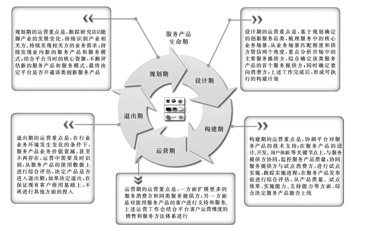 规划期的运营重点是跟踪研究清洁能源产业的发展变化,持续识别产业相关方,持续发现相关方的业务需求;持续发现业内新的服务产品和服务模式;结合平台当时的核心资源,不断评估新的服务产品和服务模式,最终决定平台是否开通该类创新服务产品。规划期运营业务过程和模型如图4-11所示。