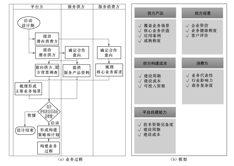 设计期的运营重点是基于规划确定的创新服务品类,梳理服务中的核心业务场景,从业务场景匹配程度和供方资信两个角度,重点分析市场中的主要服务提供方,综合确定该类服务产品的首个服务提供方;同时确定意向消费方;上述工作完成后,形成可执行的构建计划,设计期运营业务过程和模型如图4-12所示。