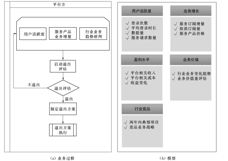 退出期运营业务过程中的核心活动是对该类服务产品当前状态的评估,本质上是对已经发布上线的该类服务产品持续跟踪客户的使用状态。退出评估模型包括用户活跃度、业务增长、盈利水平、业务价值、行业竞品等。