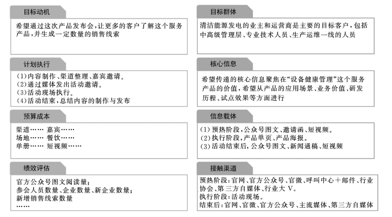 (4)核心信息:任何一次与客户的接触,都是传递信息的过程。核心信息一般可以分为与品牌价值相关的信息和与产品价值相关的信息。例如一次服务产品发布会,主要传递与该产品价值相关的信息。