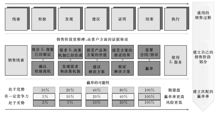 通用的销售过程一般可以概括为:从销售线索开始,通过校验、发现、建议、证明几个阶段,直至最后结束的过程;基于这个通用的过程,结合平台的实际业务情况,制定自己的销售阶段划分,销售阶段划分的依据是要以客户方的典型活动作为依据,建议的阶段划分为确认商机、发现需求和决策机制、建议解决方案、验证解决方案、赢单;针对每个销售阶段,考虑基于竞争的风险,可以确定每个阶段匹配的赢单可能性范围。