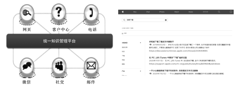 近年来,业界在客户服务运营中会普遍采用应用文本解析和搜索技术的跨渠道统一知识库来应对客户对时效性、便捷性、一致性的要求。较早应用知识库的苹果公司,坐席查找信息速度提升47%,大幅缩短电话平均处理时长、提升首次接通率,用知识库支撑的自助服务每天有超过200 万的客户发起搜索。统一知识库应用如图4-25所示。