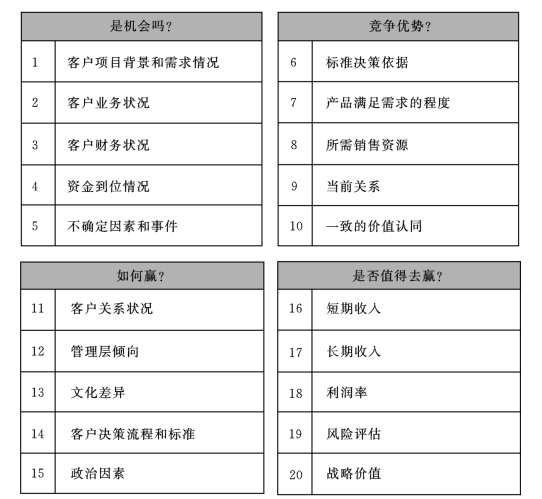 商机评估是企业端销售过程中最常使用的评估。商机评估图模型如图4-21所示。这个评估模型通过四个维度的20个问题,来综合评价一个商机的当前健康状况。