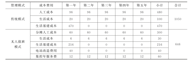 以某一电站为例,即使不考虑人工成本增长率,电站建设运行5年后无人值班模式电站成本较传统管理模式电站成本节省404万元,平均电站每年可节省80.8万元,不同管理模式下的成本费用表见表5-1。