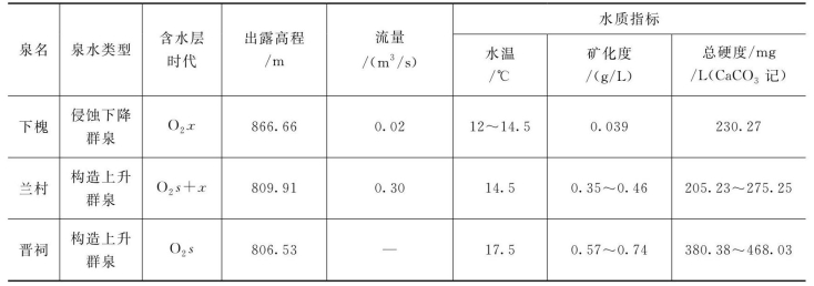 (3)岩溶水的排泄。西山岩溶地下水的排泄有3种方式:一是沿汾河河谷排泄的侵蚀下降群泉,属于此类的有下槐群泉和下槐—兰村间的散泉(五梯等地);二是边山断裂带的构造上升群泉(兰村泉、晋祠泉);三是沿边山断裂带侧向或越流排向盆地的冲洪积层,泉群主要水文地质特征见表4.3。