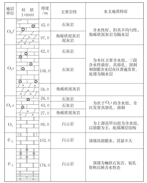 1)Ⅱ1亚区:补给条件好的弱岩溶层亚区。受地层掀斜抬升影响,下奥陶统及寒武系地层成为主要岩溶发育层位,但它们发育程度一般较弱,发育极不均匀。