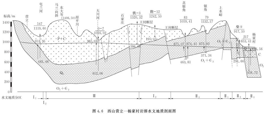 本区碳酸盐岩层的埋藏深度(上覆非可溶性基岩厚度)为300~1000m。随着埋藏深度的增加,也就逐渐失去了岩溶发育的条件,因此成为岩溶地下水径流的封闭区,即径流都绕本区的外围运动。这种情况已得到马兰向斜北段和马兰向斜与石千峰向斜间沿大川河谷的水文地质深钻孔的证实。庙前山上的官地扩区1号孔,表明奥灰顶面埋深达900m左右,条件与草庄头J9号孔相似。再向西南部发展,碳酸盐岩层的埋藏深度还逐渐加大,径流条件就更为不利。