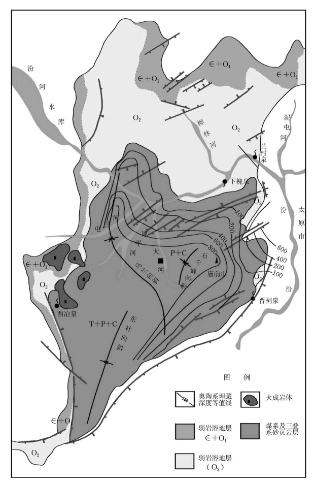 (2)西山地质构造和水动力条件的地质历史演变,决定了岩溶发育的现状。西山煤田是由西、北、东三面向内倾斜,总的趋势为SSW向倾伏的不对称向斜构造,从而构成了西山寒武、奥陶系碳酸盐岩的埋藏条件。西山向斜的西、北和东北部,为碳酸盐岩裸露和半裸露区,向内侧为由北而南依次分布的浅埋藏区和深埋藏区。而在西山煤田的东部和东南部边山断裂带两侧,由于受山区和盆地升降差异的新构造运动影响,造成区域侵蚀基准面自西北向东南、由北向南不断深切,构成了西山岩溶地下水运动的主要水动力条件。