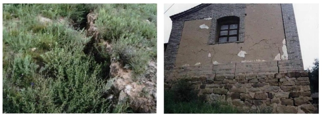东孟村为煤层采空区。村西1000多米的山顶出现群缝,主裂缝长约100多米,宽80cm,黄土填埋,缝深不可见底。原水井一米多深即见水,而今当地浅层孔隙和基岩裂隙均无水。东孟村共发育5条地裂缝,裂缝间彼此平行,其空间位置对应于采空区。单缝长3~100m,宽0.3~0.8m,分布面积1.5km2。目前已造成100余间房屋、500亩耕地不同程度的受损,造成3眼水井干枯,直接经济损失达78.99万元。东孟地裂缝见图4.58。