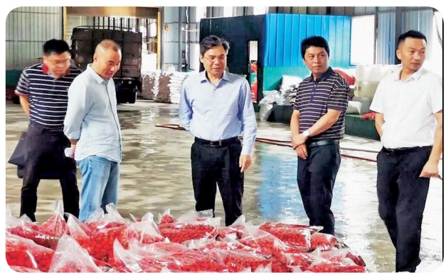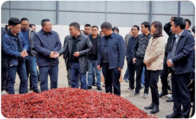 10月16日,县长陈祥彬(前排左二)、副县长李章和(前排左四)一行到龙街乡调研辣椒产业发展情况(供图:缪强龙)