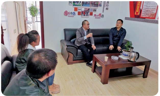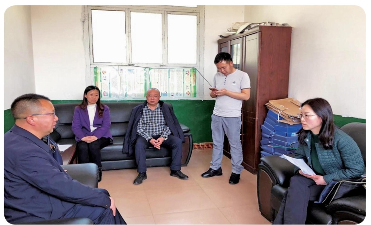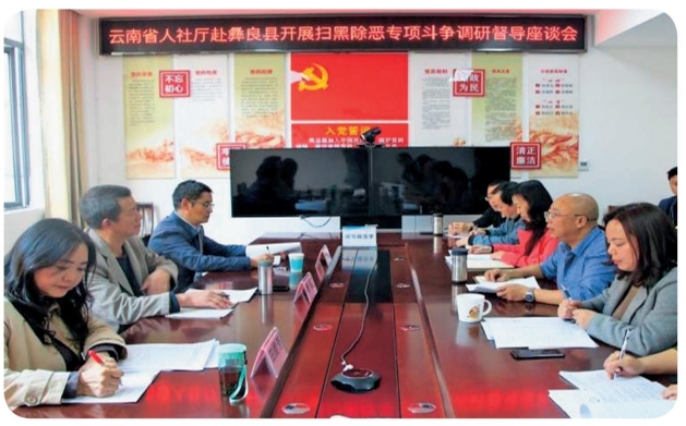 11月19日,省人社厅扫黑办副主任徐骏(左二)到县人社局督导扫黑除恶专项斗争(供图:县人社局)