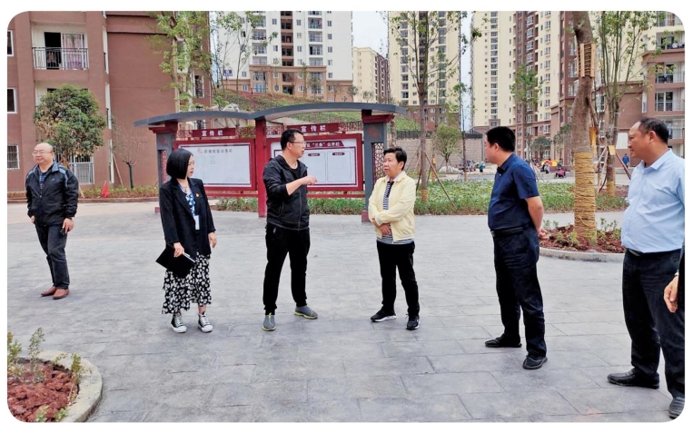 5月27日,市委宣传部副部长、市文明办主任潘为民(前左一)到发界安置区调研社区网格化服务管理和新时代文明实践站建设情况(供图:县搬迁安置局)