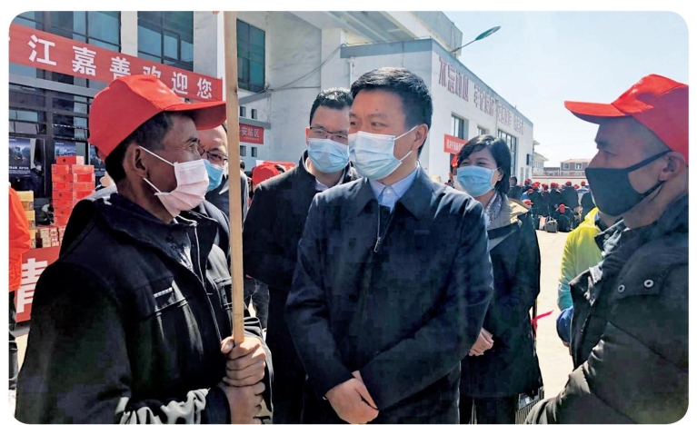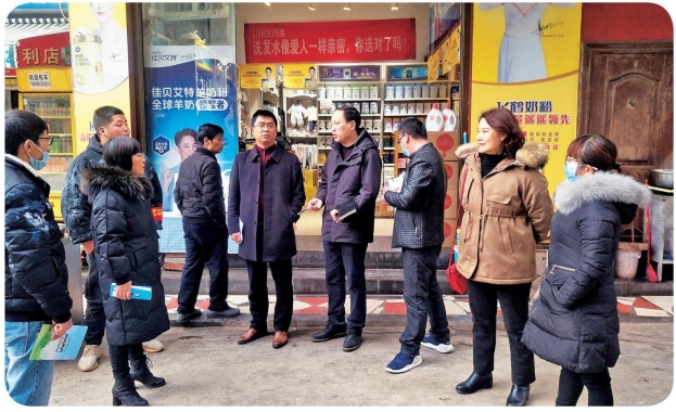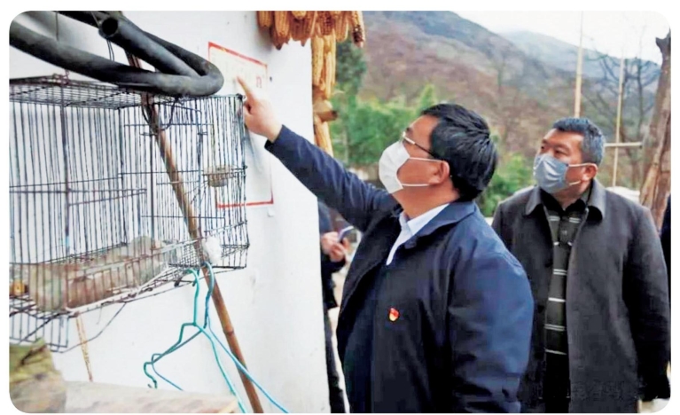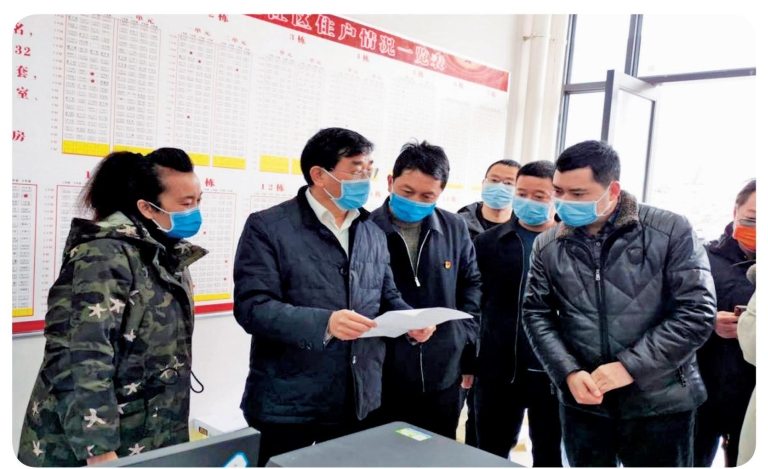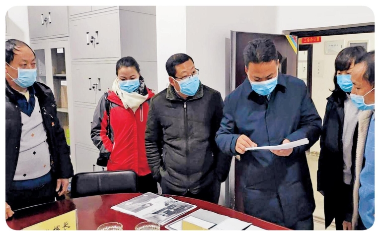 1月31日,副市长段登位(左四)在毛坪村检查疫情防控工作(供图:洛泽镇党政办公室)