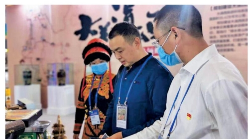 11月17日,市人民政府驻杭州招商联络处主任、市文旅局副局长范镇(中)到“2020中国国际旅游交易会”指导小草坝旅游公司参展工作 (供图:县开投公司)
