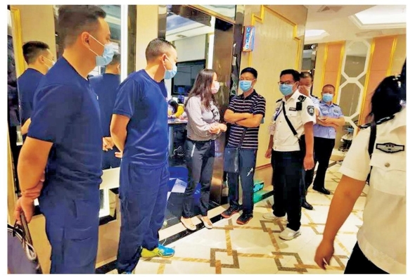 9月2日,副县长梁华(左三)率相关执法部门工作人员对县城足浴、酒吧、网吧等文化娱乐场所进行巡查(图片来源:公众号“微彝良”)