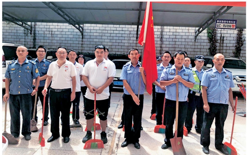 8月28日,县交警大队、人保公司等单位参与爱国卫生清扫工作 (供图:人保公司)