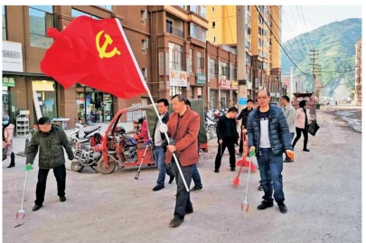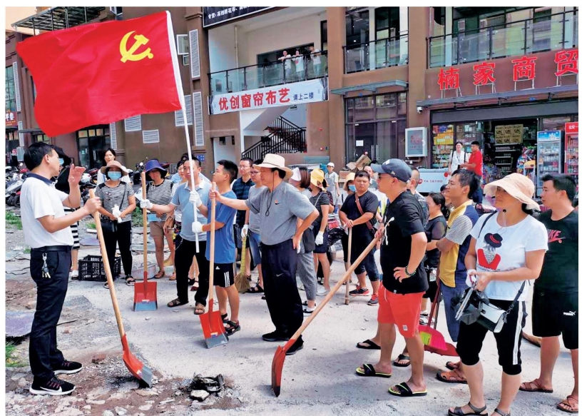8月31日,农业农村局干部职工在网格区域(渔湖新城片区)开展党旗引领爱国卫生运动(摄影:黄仕勇)