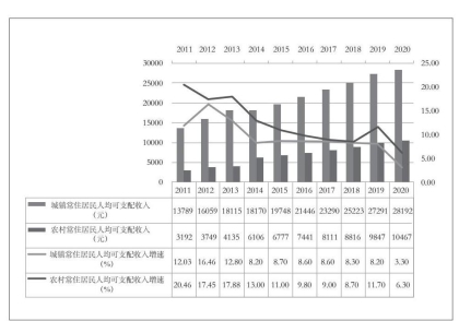 图8 2011-2020年彝良县城镇(农村)常住居民可支配收入及增速