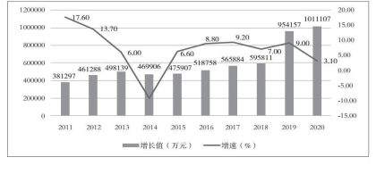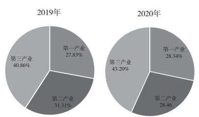 统计测算,2020年全县实现生产总值(GDP)1011107万元,比上年增长3.1%(按可比价计算,下同)。其中:第一产业增加值完成286548万元,比上年增长5.5%;第二产业增加值完成287723万元,比上年下降4.6%;第三产业增加值完成436836万元,比上年增长8.%。