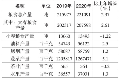 全年粮食总产量达221091吨,比上年增2.37%。其中:大春粮食产量207598吨,比上年增长2.61%;小春粮食产量13493吨,比上年下降1.22%。油料产量56122百千克,比上年增长2.5%;烤烟产量58759百千克,比上年增长1.2%;蔬菜产量1267471百千克,比上年增长5.1%;茶叶产量564百千克,比上年下降0.2%;水果产量37031百千克,比上年增长1.3%。