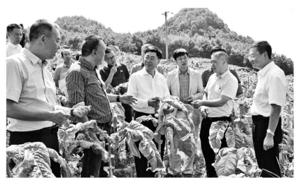 9月1日,云南中烟工业有限责任公司党组书记、董事长陈卫东(前排左三)率领红塔集团党委书记、董事长王勇(右三)一行到龙街乡调研指导田间烟叶成熟采烤工作