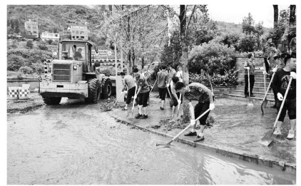 大队工作人员参与城区道路淤泥清扫