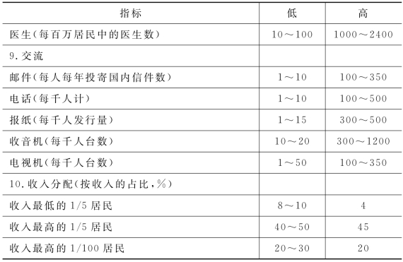 (2)1966年,西里尔·爱德华·布莱克(Cyril E Black)教授分别从经济发展水平和社会流动水平的角度,提出了能大体揭示“前现代化社会”向“高度现代化社会”转变过程中所发生变化的现代化10项标准(见表0-1)。布莱克提出的这10项标准,反映了学术研究对社会和时代的关心,反映了人们力求寻找一种比较简单明了的方法去测量社会发展水平的心理,但由于这些指标不够精确,可操作性不强,一般只是作为文献被引用,没有成为度量现代化进程的有效工具。