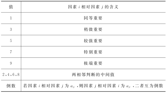 第二步,构造判断矩阵。对同一层次的各个指标关于上一层次中某一准则的重要性进行两两比较,构造两两比较的判断矩阵(通常需要结合专家经验对指标的两两相对重要性作出判断)。层次分析法中构造判断矩阵的方法是一致矩阵法,即不把所有因素放在一起比较,而是两两相互比较;此时采用的是相对尺度,尽可能减少性质不同因素相互比较的困难,以提高准确度,如表3-1所示。
