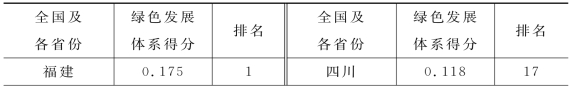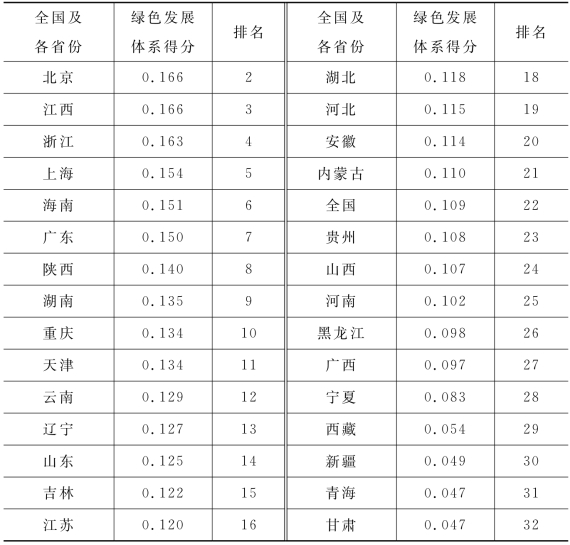本研究主要从资源节约、环境友好及环境治理能力改善三个维度衡量绿色发展体系的水平。绿水青山就是金山银山,生态保护与经济发展并不矛盾反而相辅相成;保护环境就是保护生产力,改善环境就是发展生产力。在绿色发展体系得分中,福建、北京、江西、浙江、上海得分较高,说明其既很好地提高了经济发展水平线又守住了保护生态的红线,充分将经济发展与环境保护与治理融合起来,走上了绿色低碳发展的道路。而宁夏、西藏、新疆、青海、甘肃的绿色发展体系得分较低,说明其经济发展与环境保护的边际效益还有待进一步提高。
