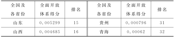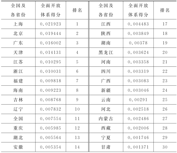 中国经济的腾飞得益于对外开放政策,对外开放程度的高低关乎经济发展的命脉,当今世界经济虽然存在局部动荡,但经济全球化的推进是一个不可逆的过程。本研究的对外开放体系主要从对外开放总体水平、对外吸引力、引进来走出去三个维度衡量各省份的对外开放程度。从表4-15可以看出,上海、北京、广东的对外开放程度排在全国前三位,而甘肃、贵州、青海的对外开放程度排在末三位,这符合中国社会经济发展的现状,开放程度高低依次是东部沿海地区>中部地区>内陆边境地区>纯内陆地区,甘肃、贵州和青海位于开放程度最低的纯内陆地区。要提高各省份,尤其是内陆省份的对外开放程度从而提高其对外开放体系水平,需要大力加强陆海内外联动和东西双向互济的经济机制建设。