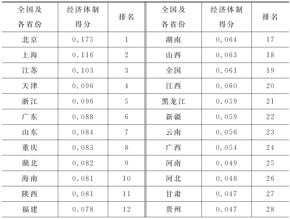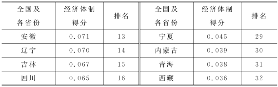经济体制主要从经济增长、物价稳定、就业稳定和宏观调控上反映政府对经济的作用情况,经济体制得分的高低很好地体现了政府对社会经济贡献率的高低,社会主义一大特征就是能集中力量办大事,这是资本主义所无法完成的,而政府是否有为很大程度上决定了政府集中力量办大事的能力强弱,也表现了一国经济体制的有效性。在经济体制得分中,北京、上海、江苏、天津和浙江得分较高,而贵州、宁夏、内蒙古、青海和西藏的得分较低。