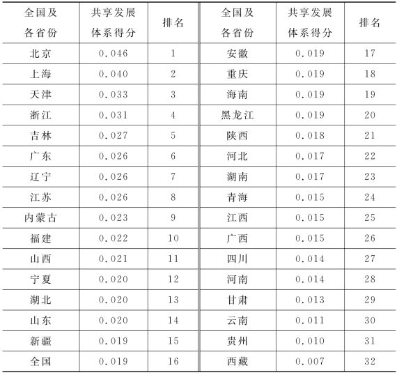 共享发展体系体现经济的发展是否很好地惠及了人民。共享是社会主义本质的具体变现,现代化经济体系提升的衡量标准;它要求经济发展成果由人民共享、公共资源由人民共享、科技发展由人民共享、医疗卫生惠及人民、教育由人民共享等等。因此,得分越高,表明人民共享发展的水平越高、程度越深,就越能体现社会主义的优越性。北京、上海、天津、浙江、吉林在共享发展体系中位列前五名,表明其现代化经济的共享程度较高;而河南、甘肃、云南、贵州、西藏排名末五位,现代化经济的共享程度较低,还需要在共享体系上作出更大的努力,以力求让经济发展的成果更多更好地惠及人民。从共享体系的得分和排名上我们也不难发现,位于第一梯队的基本上是东部沿海的省份;而中部地区和西部地区则位于第二和第三梯队。由此说明,在共享发展体系上,区域间的差异也较为明显。