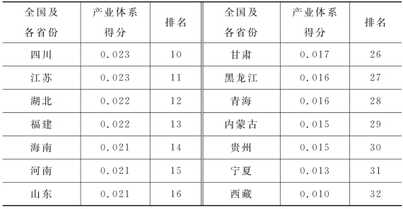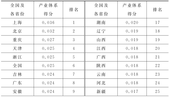 产业体系是现代化经济体系的后盾,没有完整的产业体系,就难有高水平的现代化经济体系,产业体系是国民经济的重中之重。本研究主要通过产业协调、产业发展、产业创新以及产业转型升级四个维度对全国及各省份产业体系的发展水平进行综合衡量。由表4-11可知,上海、北京、重庆的产业体系得分较高,而贵州、宁夏、西藏的产业体系得分较低,得分较高的省份,其产业更具协调性且产业的创新能力较强。例如,北京2019年的产业结构与就业结构偏离度值为0.0012,产品质量优等品率为67.4%;而贵州相应的数值为0.6772和53%。产业体系现代化是经济体系现代化的基石,提高产业体系发展水平,要从促进产业协调发展、培育产业创新能力、加快产业转型升级三个方面同时发力。