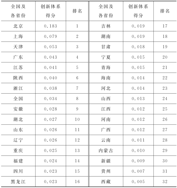 创新体系主要是从创新发展动力、创新发展水平和创新人才的培育三个方面综合衡量全国及各省份的创新体系发展水平。从得分上来看,排名前五位的分别是北京、上海、天津、广东和江苏,排在最后的五位分别是云南、内蒙古、新疆、贵州和西藏。得分的高低程度直接反映各省份创新动力的强弱、创新水平的高低和创新人才培育力度的大小。北京的创新体系得分最高,由此反映其创新水平和能力在全国及各省份中都是首屈一指的;而西藏的创新体系得分仅有0.005,表明其科研经费及人才的投入均比较低。
