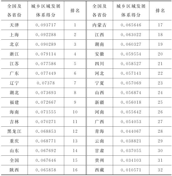 城乡区域发展体系从全民差异、区域差异及城乡差异三个方面衡量社会融合、区域融合与城乡融合发展的情况,得分越高表明区域协调发展越好。从表4-14中我们不难看出,天津、上海、北京、江苏、浙江等经济较为发达地区的经济社会发展的融合度高于经济欠发达地区;全国线的城乡区域发展体系得分排名在第15位,说明还有17个省份的区域不协调发展高于全国水平,再一次验证了不平衡和不充分的发展是制约区域协调发展的主要因素。提高区域协调发展体系水平,要在产学研深度融合和乡村振兴战略上下足功夫。