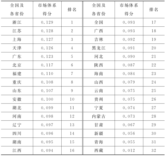 市场体系主要用来反映政商和谐程度、市场竞争是否充分以及市场环境是否良好等情况。市场体系得分越高,相应的就变现为政商和谐度较高(也即政府和市场的关系处理得当)、市场竞争较为充分以及市场环境良好。从市场体系得分上看,浙江、江苏、上海、天津、广东等地的市场体系较为完善,而内蒙古、甘肃、新疆、青海和西藏等地的市场发育水平有待进一步提高,应适当减少政府及公职人员对市场的干预和寻租行为,完善市场准入等制度,充分释放市场活力。市场体系的差异度主要体现在组间(省份之间)和组内(市场体系指标之间),因此,在提高市场体系发展水平时,不仅要注重把握市场本身,也要注重从外面吸收可供借鉴的经验做法来激发市场活力。