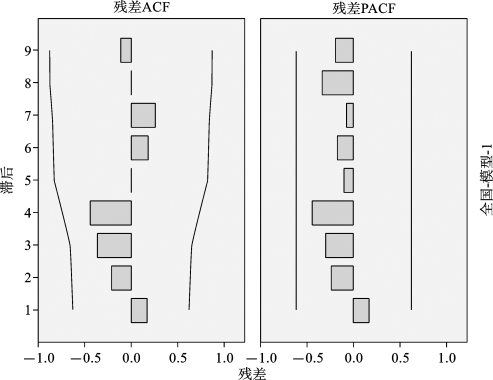 图4-2是关于残差自相关(ACF)和残差偏自相关(PACF)序列图,由图可见,两个图形都没有显著的拖尾性和截尾性。因此,可以初步判断所选的模型是比较恰当的。