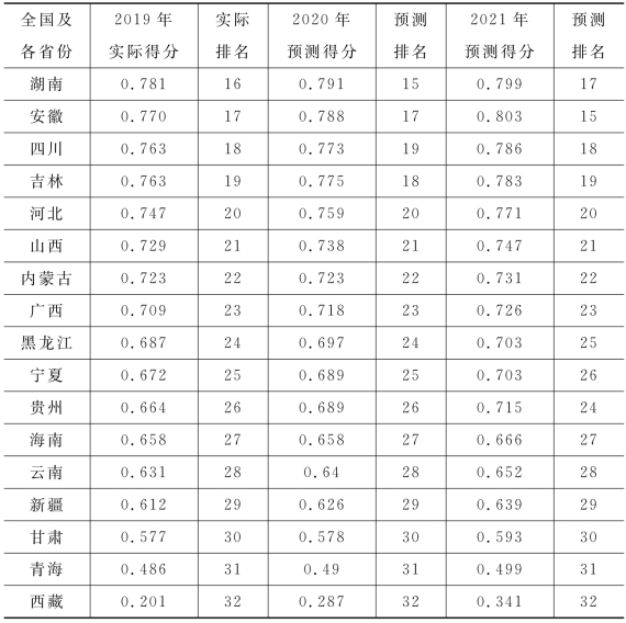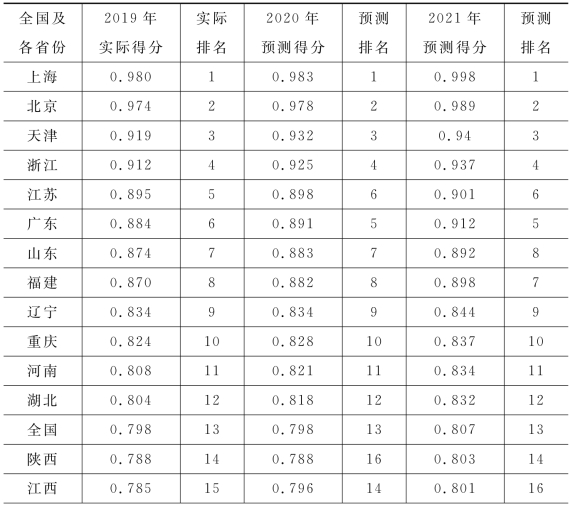 (2)根据模型预测结果,在高于全国线水平的12个地区中,2020—2021年,上海、北京、天津、浙江的现代化经济体系发展水平依然稳居全国前四位;而广东将会超过江苏取代其第五位的位置;福建也将在2021年超过山东,排名上升到第七位;其余省份排名变动不大但现代化经济体系发展水平在稳步提升。从低于全国线的省份来看,陕西和江西将会进入高现代化经济体系发展时期,现代化经济体系发展水平将会有一个质的飞跃;湖南维持在15~17位;安徽的得分和排名均有重大突破,不仅达到高现代化经济体系发展水平,排名也将从第17位上升到第15位;四川、吉林、河北、山西、内蒙古、广西得分稳定上升;黑龙江、宁夏和贵州将从低现代化经济体系水平发展到中等现代化经济体系水平;海南、云南、新疆、甘肃、青海、西藏仍然处于低水平的现代化经济体系,需要破釜沉舟式的经济变革才能会有更好的提升。