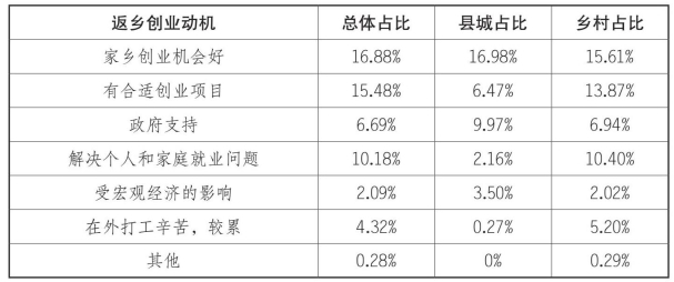在乡村的调查数据中,“家乡创业机会好”“有合适创业项目”“解决个人和家庭就业问题”占比在10%以上,分别为15.61%、13.87%、10.40%。前两项的原因选择与前述的农民工回县城创业原因大致相同。值得一提的是,选择返乡村创业的原因为“解决个人和家庭就业问题”的人数占到了10.40%,说明这部分人返乡村创业是不得已而为之的选择,因为在城市无法找到合适的工作岗位,无法解决就业问题。近些年国家和地方政府相继出台了对农民工返乡创业的各项利好政策,使得他们转向返乡创业解决就业问题,这也从侧面证明了一些学者的研究结论,即目前一部分农民工面临着在城市就业的压力。