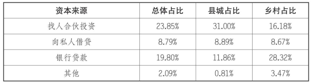 鄂皖大别山地区农民工返乡创业除自有资金外,大部分都是从非正规金融组织或个人获得资金支持(详见表3-7),其中35.56%的人会向父母或亲友借款,23.85%的人找人合伙投资。该数据充分说明了我国农村正规金融机构没有在农民工返乡创业资金支持中发挥作用,返乡创业需要靠非正规金融组织提供创业资金。从返县城和返乡村创业的分样本数据来看,除自有资金外,父母或亲友借款是其主要的创业资金来源。