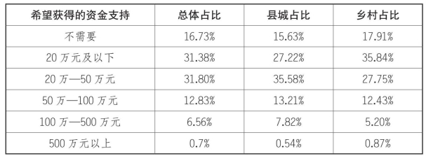 县城比乡村的资金需求意愿更强烈。县城中认为创业需要资金支持的占85%左右,而乡村中的占比约为82%。县城中资金支持需求在20万元以下的占比也明显低于县城。而在县城中,需求额度较高的50万元以上的占比则要高于乡村。这也进一步证实了返县城的农民工创办的企业规模要大于返乡村农民工创办的企业。