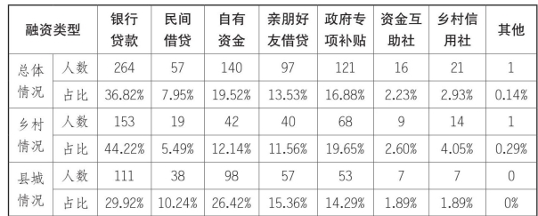 其次,乡村资本市场发展滞后,可选择的融资方式有限。企业融资方式主要有两种,一种是内源性融资,包括内部债务和内部权益;另一种是外源性融资,包括直接融资和间接融资。其中,直接融资主要有债券融资、上市融资、民间借贷、商业信用、国家专项基金等,间接融资主要是指银行贷款和非银行机构贷款。我国的资本市场起步较晚,特别是乡村资本市场发展仍相对滞后,企业难以通过发行债券或上市进行融资,因此,在县城地区,企业会选择亲朋好友资助和找合伙人投资作为主要的融资方式,而在乡村地区,企业更多的是靠亲朋好友资助来解决融资问题。此外,政府专项补贴作为直补的方式,是农民工返乡创业融资方式的有益补充。但由于近年来返乡创业的农民工人数逐年增多,特别是乡村地区企业规模小、数量多,因此,政府专项补贴从数量上难以充分满足广大乡村企业的资助需求。