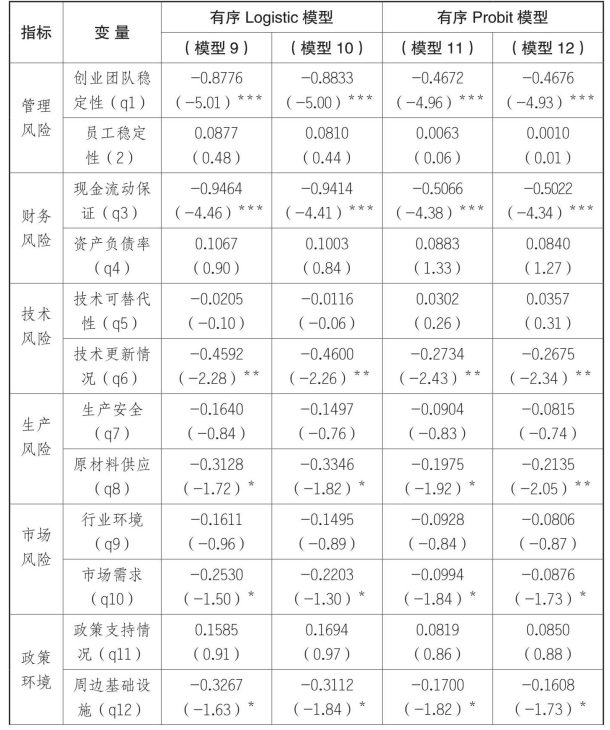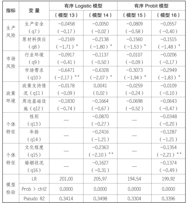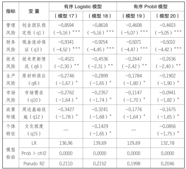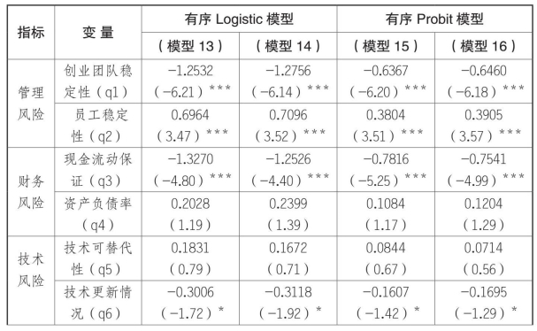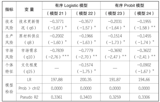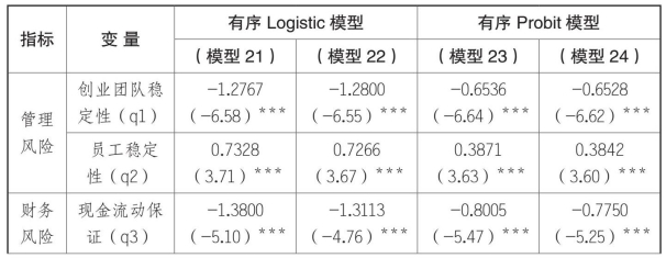 乡村的回归结果中,反映管理风险的两个指标——创业团队稳定性和员工稳定性指标统计都显著。县城中只有创业团队稳定性对投资风险有影响。说明在县城的企业中,员工稳定性情况不会对创业投资风险造成影响。可能的原因是与乡村相比,县城的可雇佣的劳动力从数量和质量上都具有优势,因此即使出现人员的流动,也不会影响企业雇佣新员工。同时,也说明了企业的生产或销售方面专业性不强,一般员工经过短期培训甚至是不需要培训就可上岗。