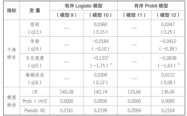 为了更加详细地了解农民工返回县城创业和返回乡村创业的投资风险情况是否存在差异,本书对返回县城和返回乡村创业投资风险分别进行了有序Logistic模型和有序Probi t模型回归分析。两个模型的P值(Prob>chi2)都为0.0000,说明两个模型整体上比较显著。回归结果见表6-4和表6-5。