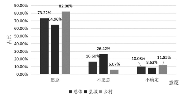 图8-1 返乡创业农民工购买投资保险的意愿(总体、县城、乡村对比)
