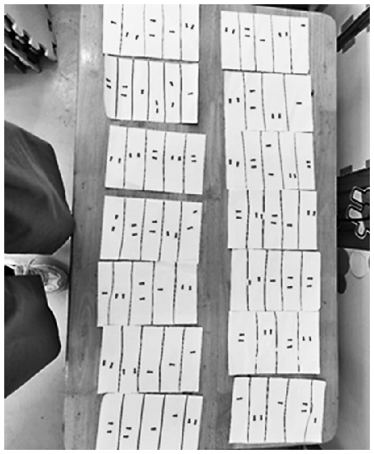 在地面画好可以供三个小朋友同时开展游戏的“房子”,幼儿用“石头剪刀布”的形式决定谁往前进一格(由于小班孩子思维能力与中大班相比还较差,所以改良了传统的“石头剪刀布”玩法规则。如果其中一个孩子出的和其他两个孩子不一样就算赢,可以往前进一步)。先到格子终点者算赢。