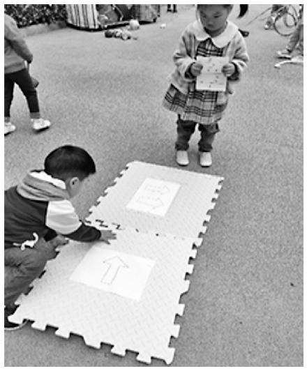 3. 幼儿按照“图纸”上的箭头方向拼搭垫子, 并按箭头方向进行转动身体跳跃,若是单箭头就单脚跳,若是双箭头就双脚跳。