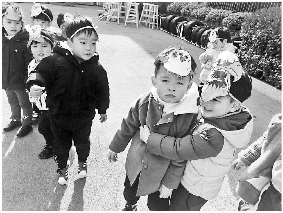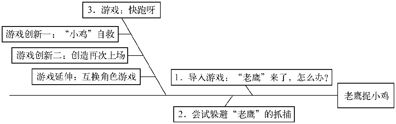 创新玩法二:原来的玩法是“小鸡”被捉到后就被罚下场,有的幼儿由于在游戏中跑得慢或躲闪能力差,很快就被捉到罚下场,然后被关在“鸡笼”里等待游戏结束,失去了游戏的机会。幼儿发现这种现象后,创新出新的玩法,就是场上的“小鸡”在躲闪跑的过程中只要用手碰一下被罚下场的“小鸡”,他(她)就可以重新上场游戏,从而为伙伴创造了多次游戏的机会。