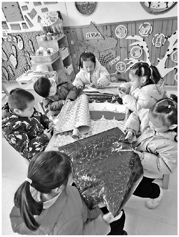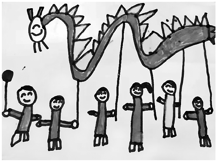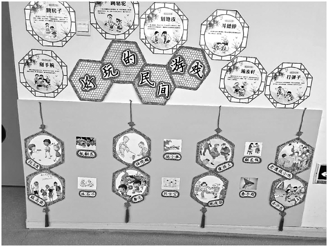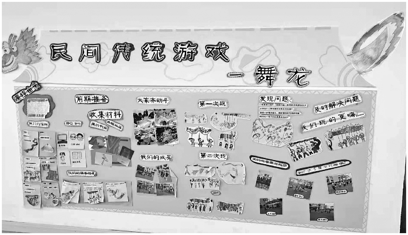 舞龙是一项民间游戏,因此在游戏期间,教师会适当地传播给幼儿一些民间文化,并在活动室的一角展示一些民间游戏的图片,在区域里摆放一些民间游戏材料,鼓励幼儿自由大胆探索,营造良好的民族文化气息。同时布置舞龙民间游戏分享墙,幼儿通过调查、探究舞龙游戏的每一步,用图片或绘画的形式呈现出来。