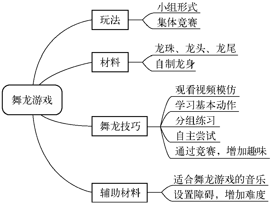准备龙珠、龙头、龙尾,龙身以长布代替,此活动需8—10位孩子参与的团体性游戏,幼儿通过观看视频,学习模仿舞龙中的几种基本动作。如:摇头摆尾(左右摆臂,上下抖动,后面的人紧跟着龙头做动作使彩龙旋转);灵龙戏珠(龙头跟着彩球灵活运动,后面的人跟着龙头运动);首尾合一(龙头与龙尾连接在一起围成圆圈);等等。